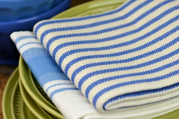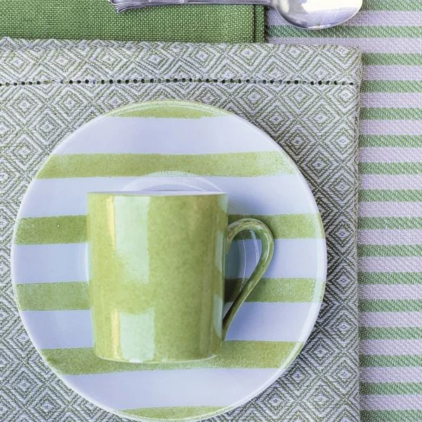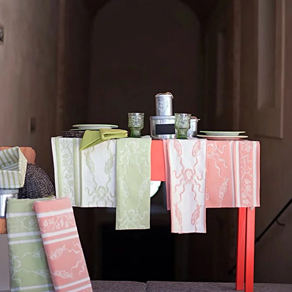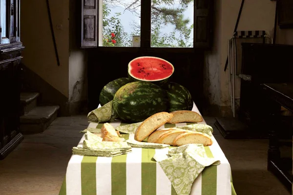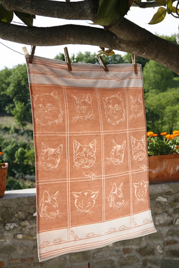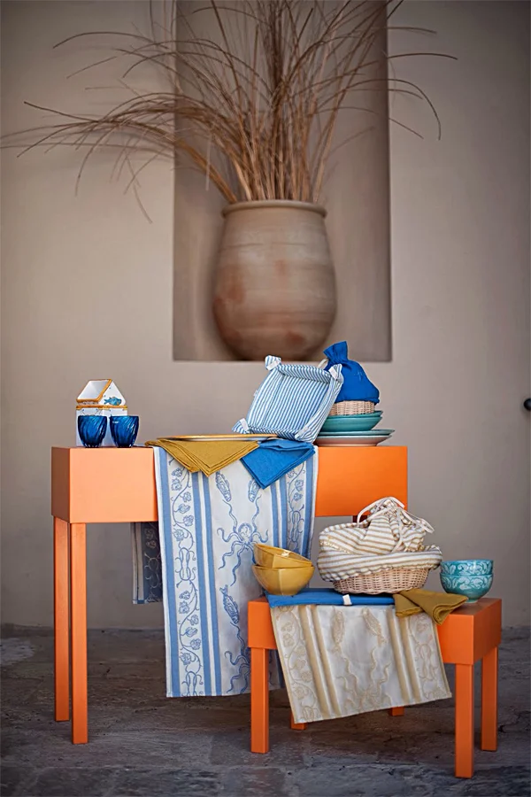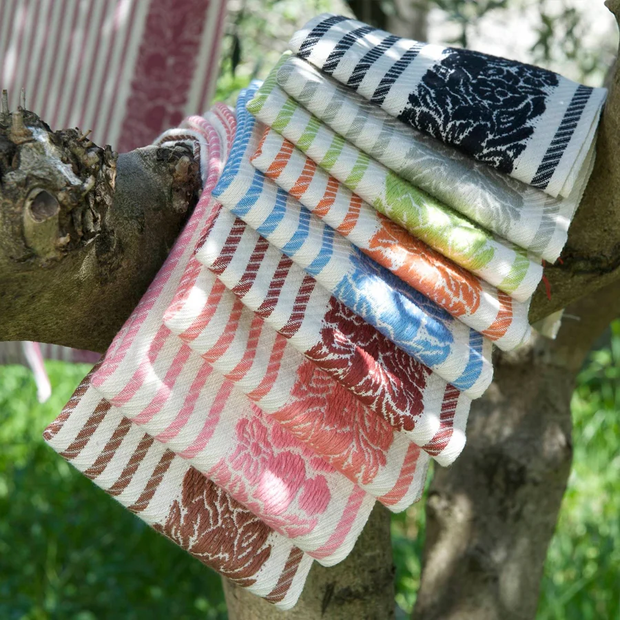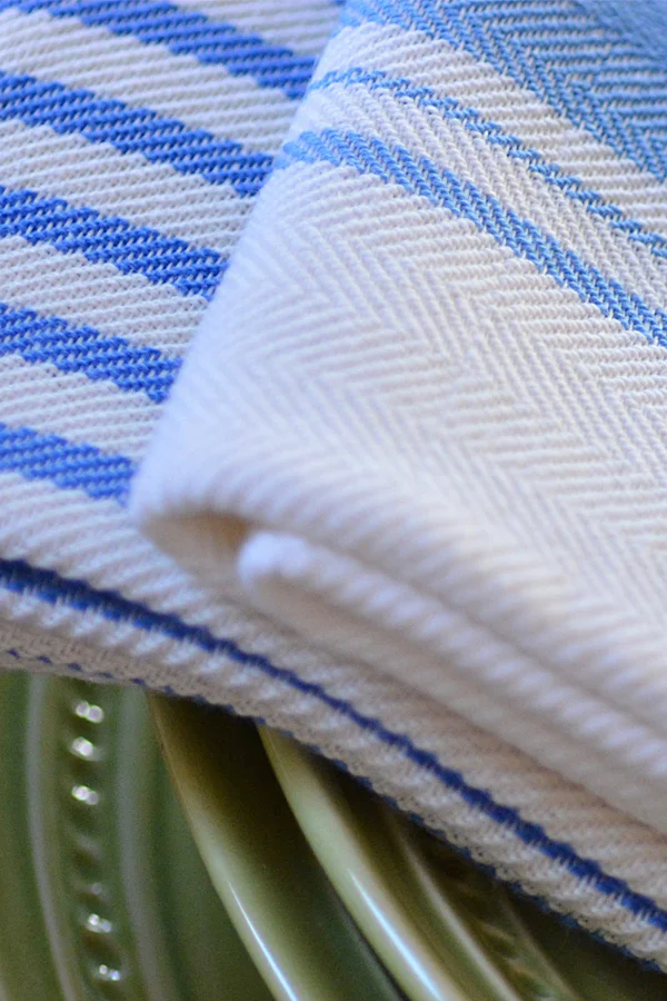 Stripes for MELOGRANO…this fabric has been part of the Busatti collection for generations. DUE FRAGOLE kitchen towel in CAMOGLI bright blue color.